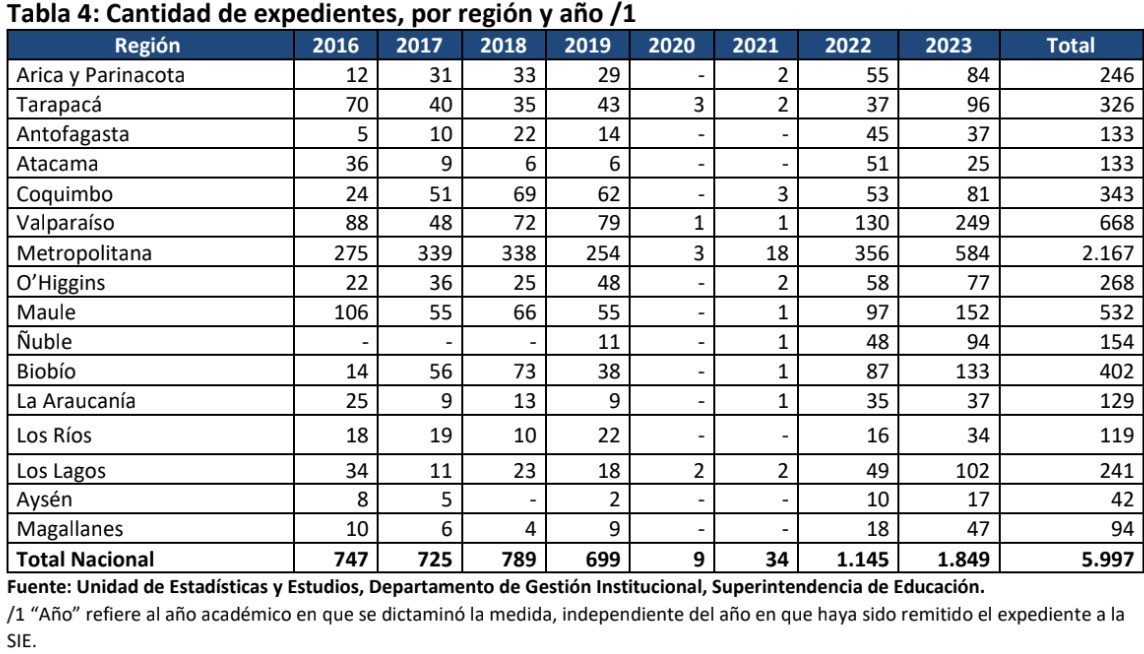 La Superintendencia de Educación indica que las regiones -fuera de la Metropolitana- "han experimentado un marcado aumento de la cantidad de expedientes respecto del periodo prepandemia". En el caso de la región del Biobío se pasó de 14 expedientes abiertos en 2016 a 133 en 2023. En total, el Biobío reúne -en todos estos años- 402 expedientes de estos procedimientos, siendo la tercera región con más cantidad de medidas disciplinarias de esta índole luego de Valparaíso (668) y la Metropolitana (2.167).