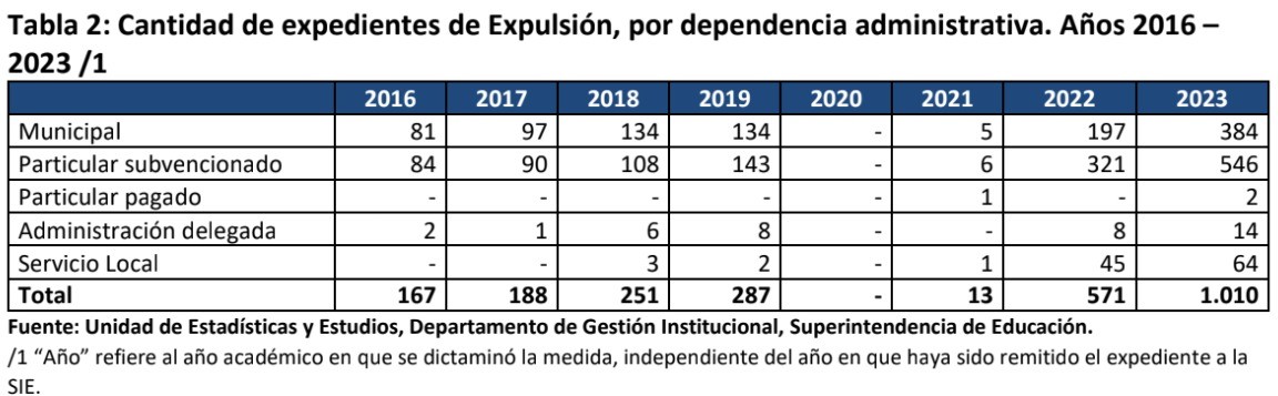 Sobre las mismas expulsiones, en 2016 los expedientes alcanzaban los 167 -concentrándose la mayoría de casos también en colegios particulares subvencionados- y saltando a 1.010 en 2023, con 546 casos en establecimientos de la misma administración.