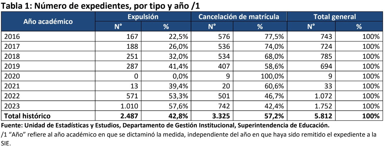 Sin embargo, y pese a que las cancelaciones de matrícula cuentan con mayor cantidad, son las expulsiones las que han tenido un sostenido aumento anual, determinando que en 2023 "la cantidad de expedientes de expulsión (1.010) superó considerablemente la cantidad de expedientes de cancelación de matrícula (742)".