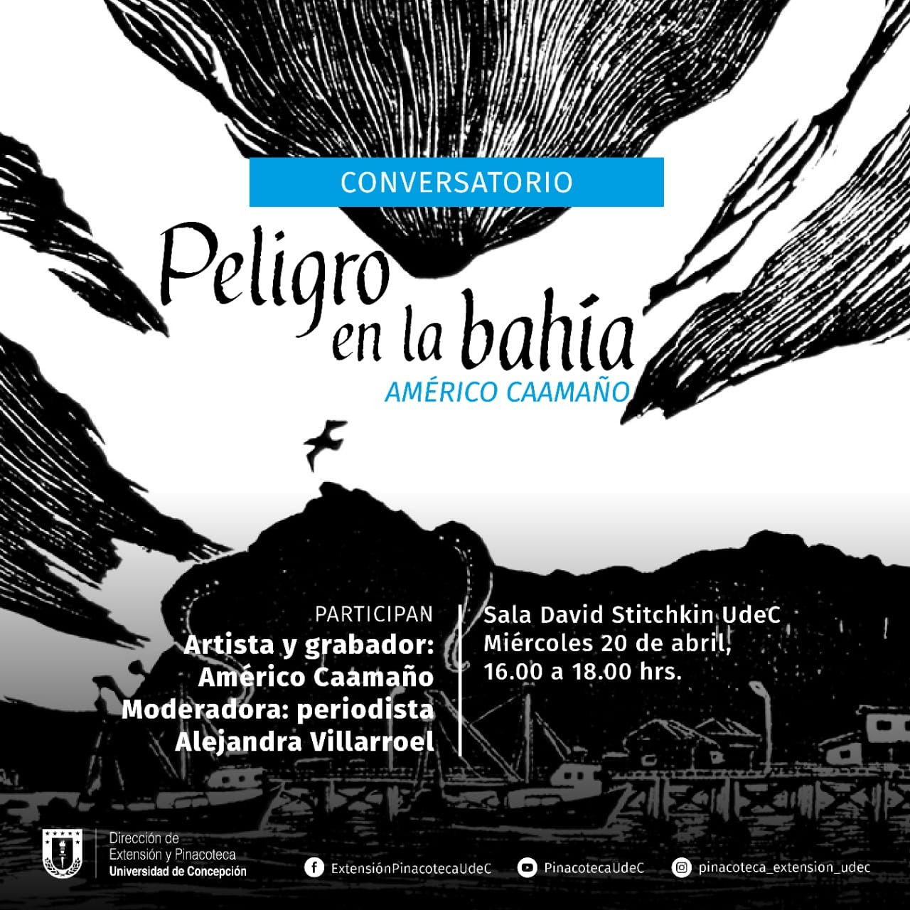 El conversatorio es organizado por la Dirección de Extensión y Pinacoteca de la Universidad de Concepción y guiado por la periodista Alejandra Villarroel Sánchez. La muestra PELIGRO EN LA BAHÍA permanecerá abierta al público, de martes a viernes de 10:00 a 13:00 y de 15:00 a 18:00 horas, sábados de 10:00 a 14:00 horas. Entrada liberada.