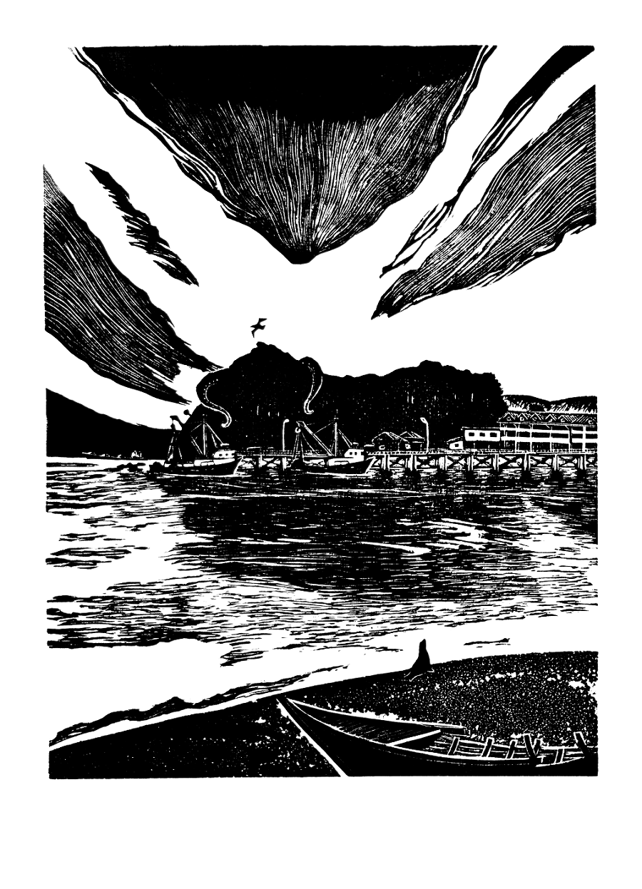Las localidades de Coliumo, El Morro, Cocholgüe, Quichiuto, Lirquén, Punta Talca, Los Bagres, Punta de Arco son algunos de los escenarios naturales representados en las 27 piezas que componen la muestra, territorios que Américo Caamaño mapea situado en la esfera del imaginario propio que posee como habitante litoral, pero también, desde una toma de posición política. Más aún desde el grabado, técnica que goza de una actividad consolidada en la región y la potencia de construir posibles crónicas de los sucesivos presentes de las memorias colectivas.