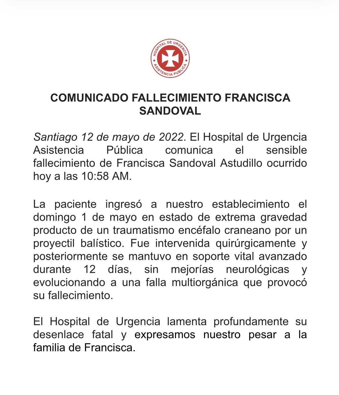 La información fue confirmada por el equipo comunicacional del Hospital de Urgencia Asistencia Pública, que a través de un comunicado público lamentó el deceso de la periodista.