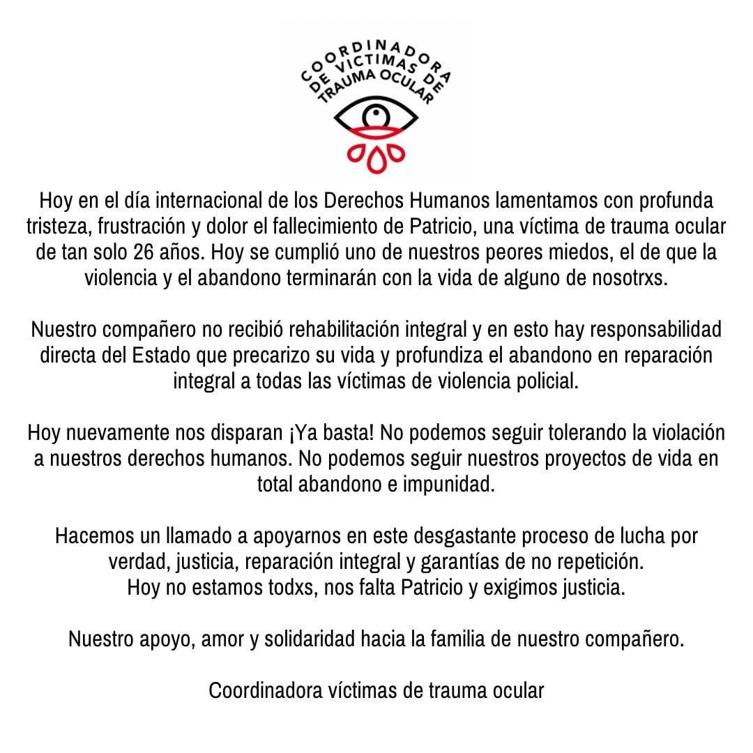La organización expuso que “nuestro compañero no recibió rehabilitación integral y en esto hay responsabilidad directa del Estado que precarizó su vida y profundiza el abandono en reparación integral a todas la víctimas de violencia policial”. En marzo de 2020, el Instituto de Derechos Humanos estableció la existencia de 460 personas con heridas oculares, aunque posteriormente la Coordinadora de Victimas por Trauma Ocular ha inidicado que serían más de 500 personas agredidas con consecuencia de trauma ocular. Todas enfrentan la ausencia de una política de reparación y también a la impunidad con la cual la clase gobernante ampara a quienes han perpetrado tales crímenes. De hecho, ha denunciado que los recursos presupuestados para el Programa Integral de Reparación Ocular no han sido destinados íntegramente a él, además de registrarse despidos de sus trabajadoras/es, agravando las falencias que desde el inicio de su tratamiento les revictimizan.