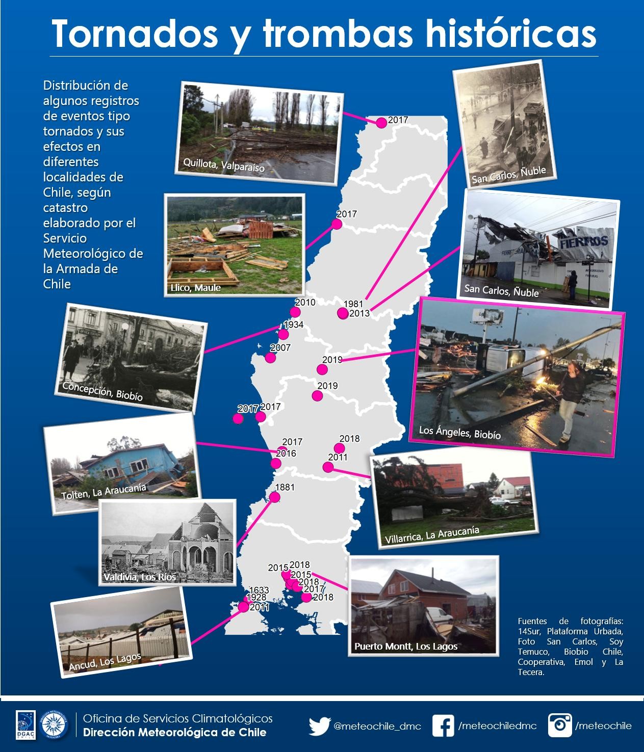 La Oficina de Servicios Climatológicos de la Dirección Meteorológica de Chile elaboró una cronología de tornados y trombas marinas en la zona central sur de Chile.