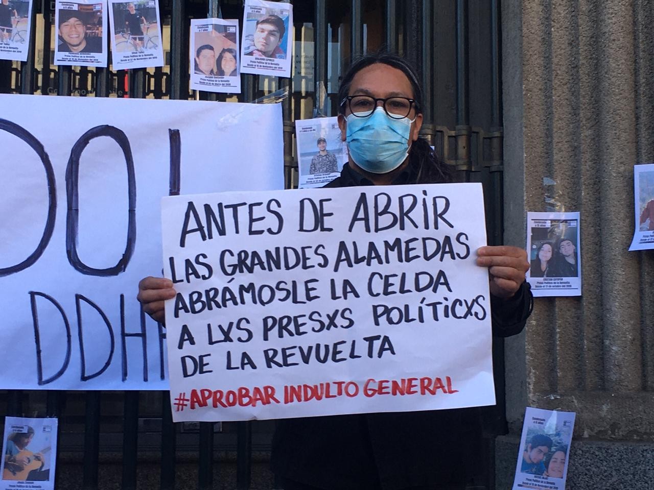[resumen.cl] Integrantes de la Asamblea Nacional de Familiares de Presos Políticos y el Grupo de Iniciativa por la Libertad de los Presos Políticos se convocaron este martes en las afueras del Ministerio de Justicia entregando una carta para desmitificar los dichos que el Gobierno ha presentado contra el proyecto de ley de Indulto General.