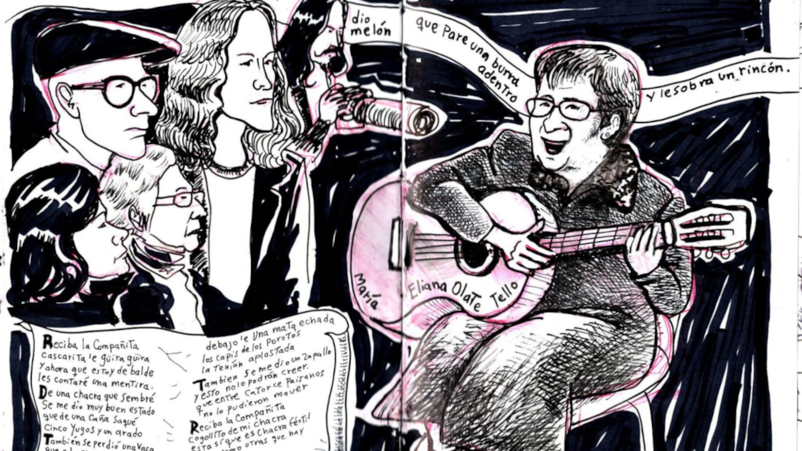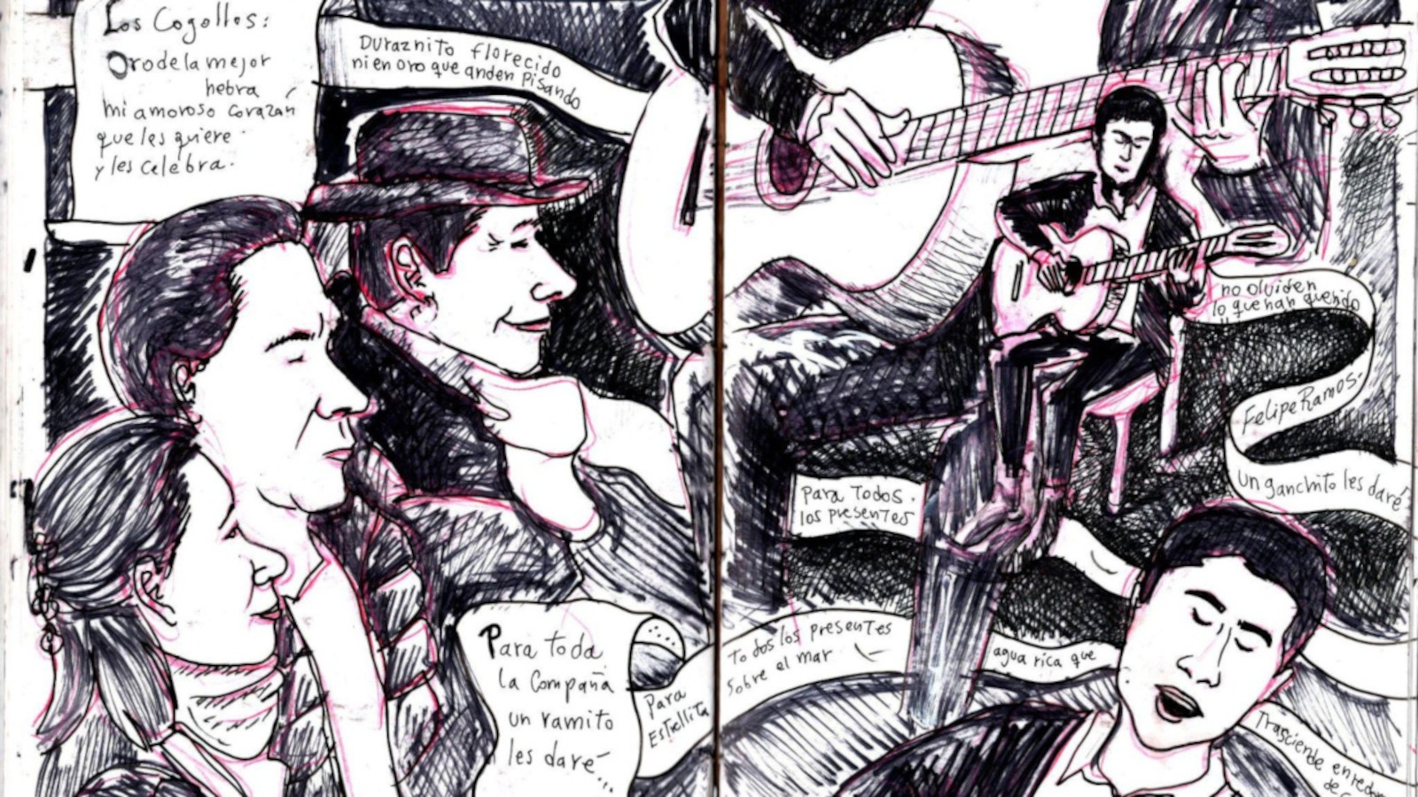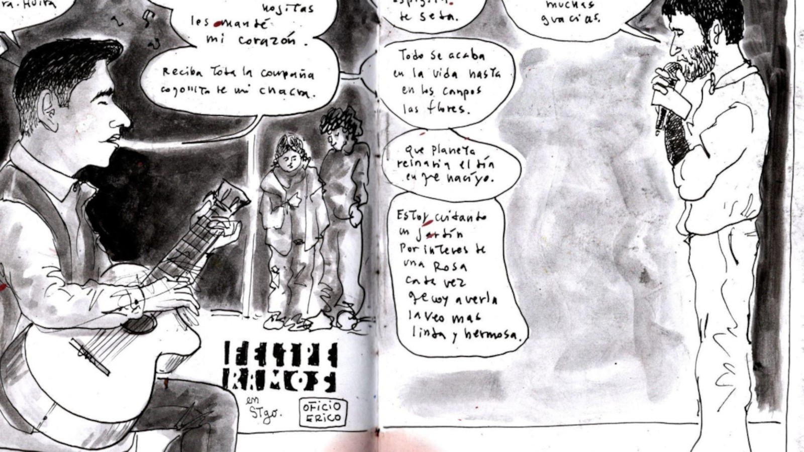 Luego de nuestra conversación el público comenzó a pedir cuecas. Felipe aceptó y, apenas arrancó con los primeros acordes, las palmas marcaron el compás y los asistentes se lanzaron a la pista improvisada para bailar. Hay momentos en que tengo la impresión de que Felipe fuera poseído por una fuerza antigua, como si todos los cantores y cantoras del pasado se canalizaran a través de su voz y del rasgueo de sus cuerdas. Sigo dibujando.