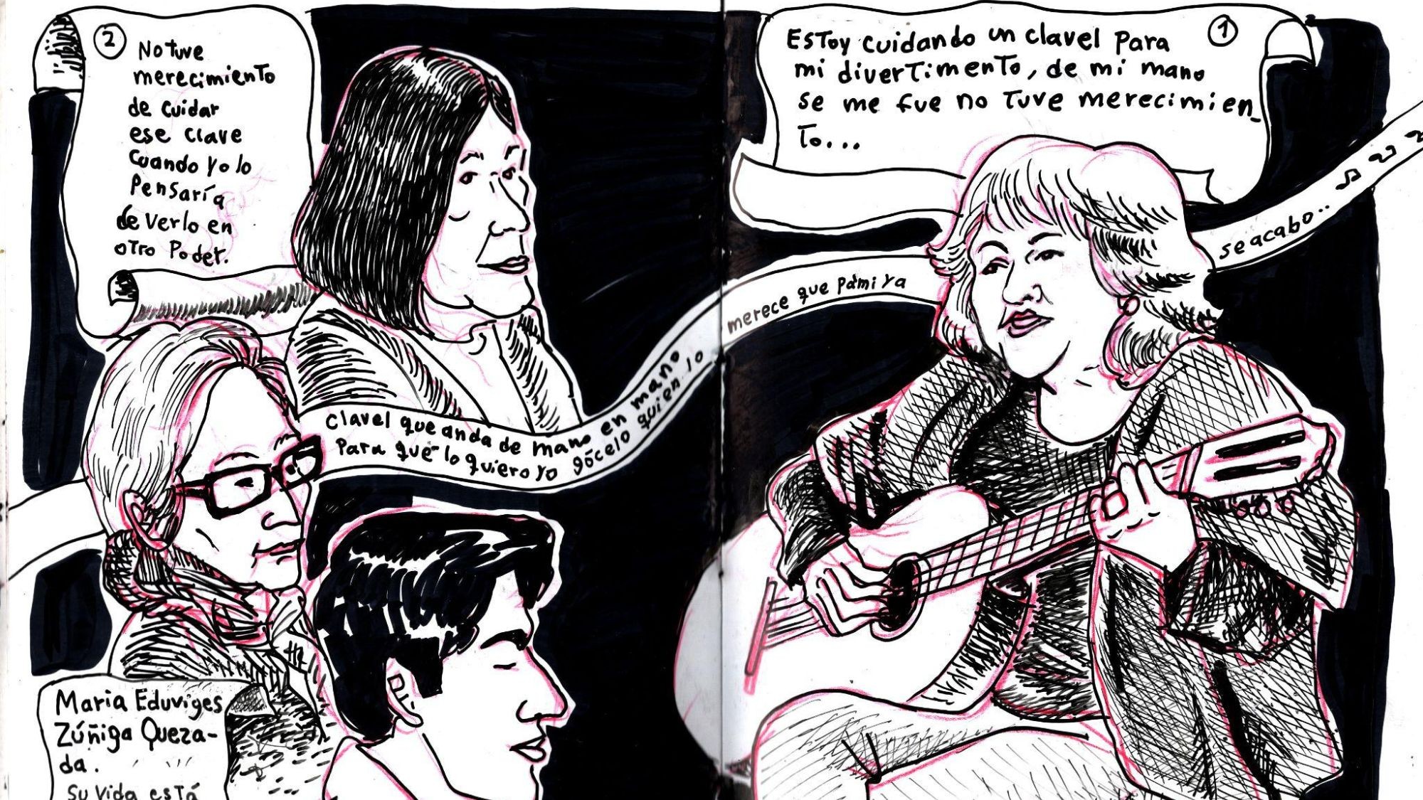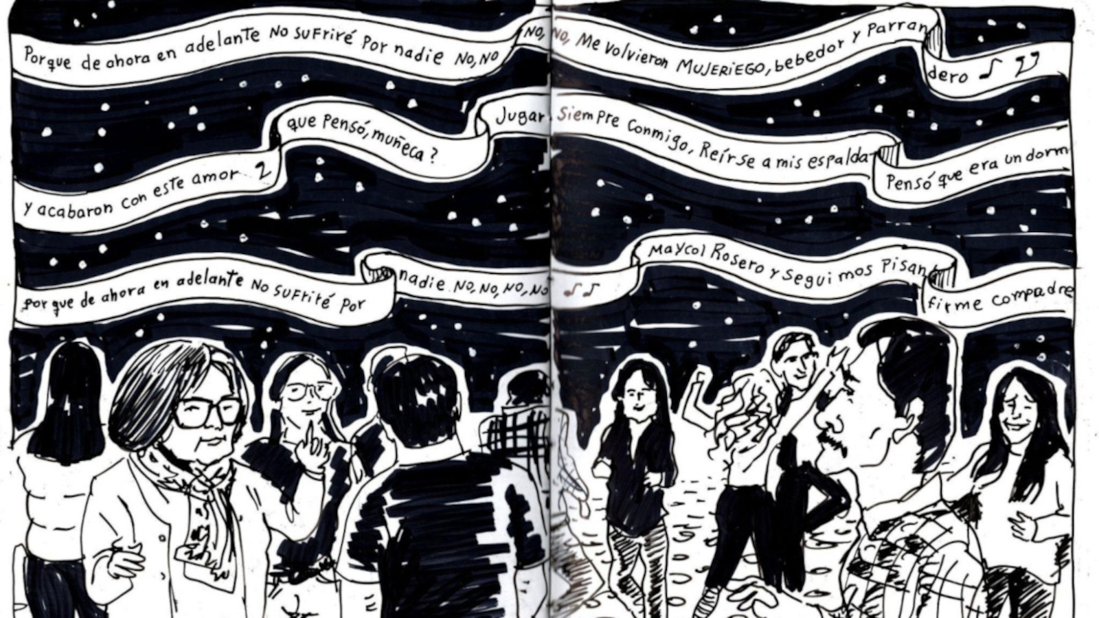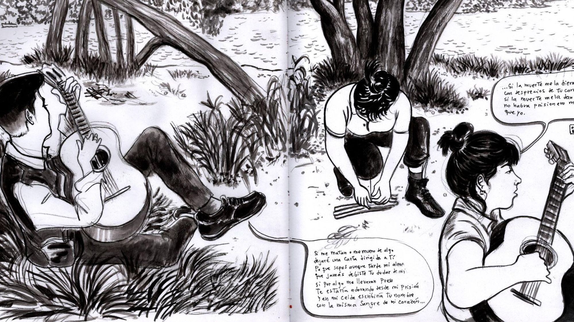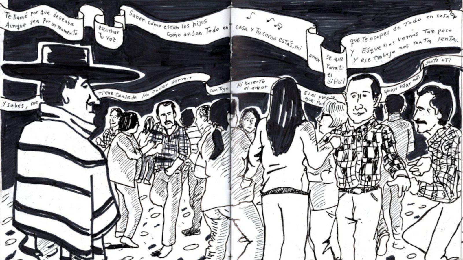 Luego de nuestra conversación el público comenzó a pedir cuecas. Felipe aceptó y, apenas arrancó con los primeros acordes, las palmas marcaron el compás y los asistentes se lanzaron a la pista improvisada para bailar. Hay momentos en que tengo la impresión de que Felipe fuera poseído por una fuerza antigua, como si todos los cantores y cantoras del pasado se canalizaran a través de su voz y del rasgueo de sus cuerdas. Sigo dibujando.