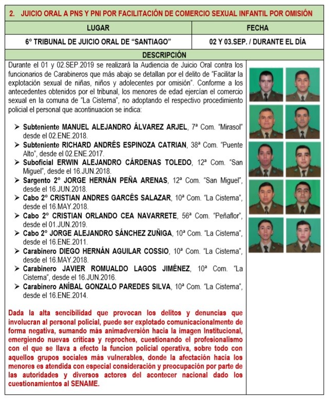 La nueva filtración vuelve a poner al descubierto el actuar de la institución y parte de su personal fuera de todo protocolo. Los 10 carabineros que aparecen en el documento titulado “Boletín de actividades proyectadas y seguridad institucional Nº 02”, están acusados de facilitación de explotación sexual de menores de edad en la zona sur de la Región Metropolitana.