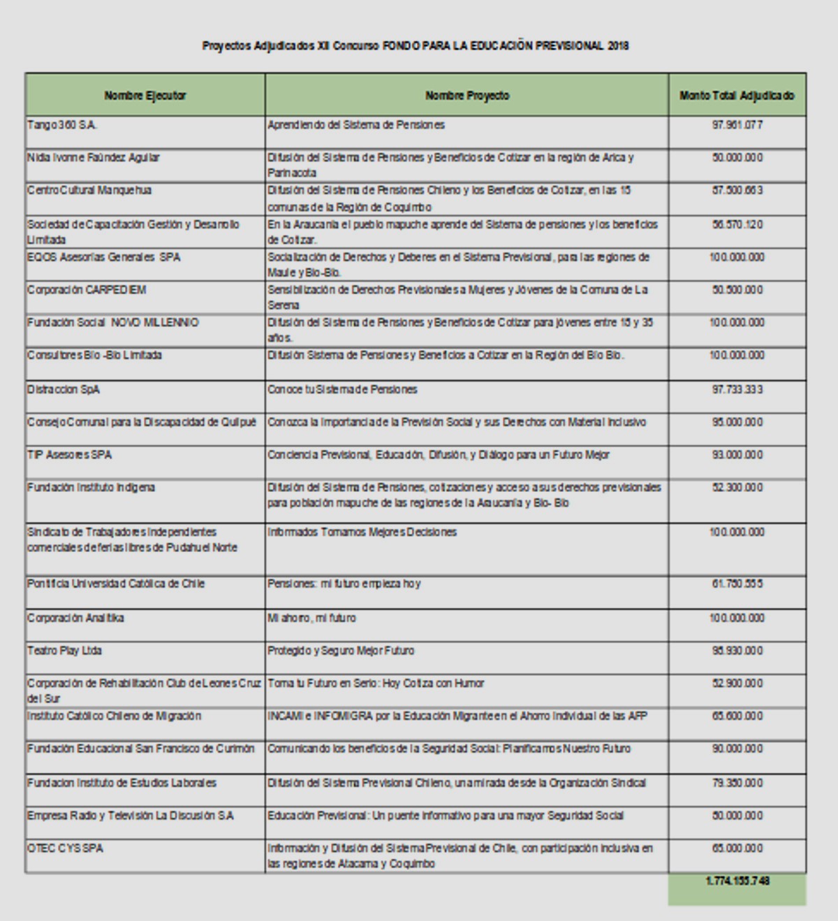 Para ello, la Subsecretaría de Previsión Social realiza anualmente un llamado para que distintas entidades (Personas Naturales o Jurídicas, y Entidades Públicas debidamente facultadas para tal efecto), participen del Fondo para la Educación Previsional a través de este concurso público. En la ejecución del concurso del 2018, se adjudicaron 22 proyectos por un total de $ 1.774.155.748. Los proyectos pudieron postular a un mínimo de 50 y un máximo de 100 millones.
