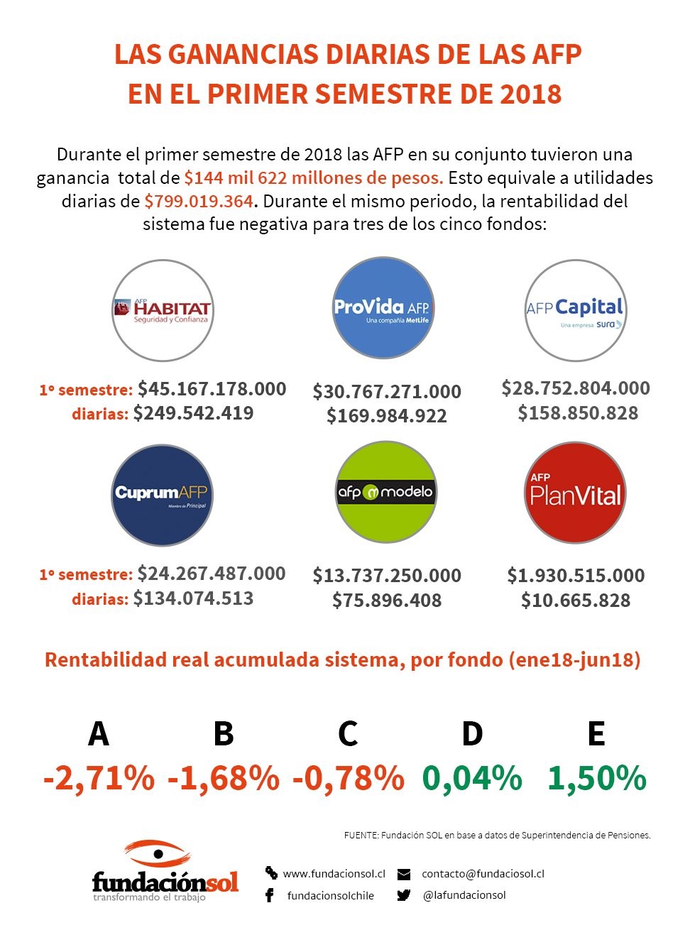 Cabe mencionar que El 1ºsemestre de 2018, las AFP alcanzaron utilidades diarias de $799.019.364, mientras que en el mismo periodo la rentabilidad del sistema fue negativa para 3 de 5 fondos de pensiones, según cifras de la Superintendencia de Pensiones difundidas por la Fundación Sol.