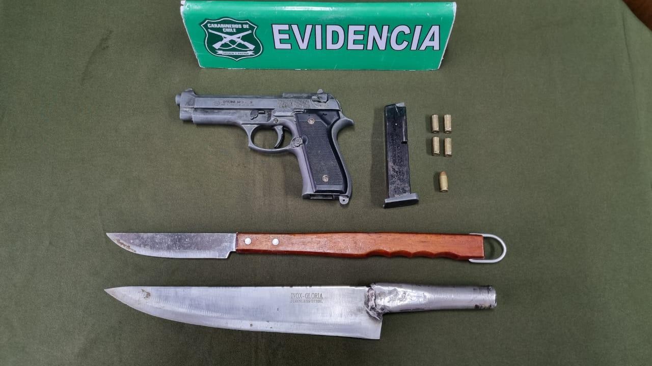 En el lugar de los hechos carabineros encontró un arma de fuego modificada sin percutir y dos cuchillos que habrían sido utilizados por los acusados.