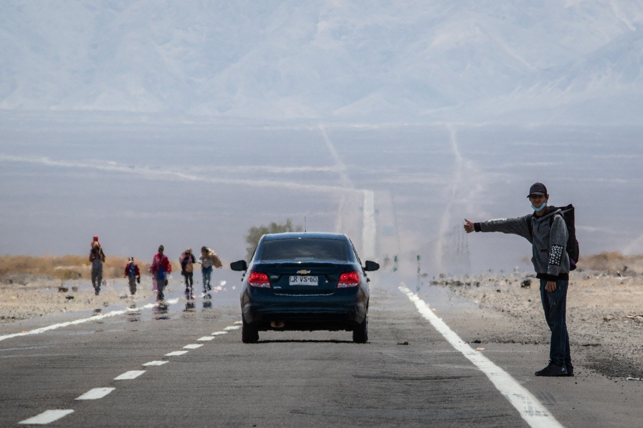 Así, centenares de personas, familias, niñas/os y adultos mayores, deambulan por la ruta CH-15 que une a Colchane y Huara, una localidad aledaña a la que buscan llegar para realizar el proceso de “autodenuncia” en la comisaría del poblado, estrategia que han utilizado masivamente para agilizar la regularización de su estadía y para ser trasladados hacia Iquique y, posteriormente, a residencias sanitarias.