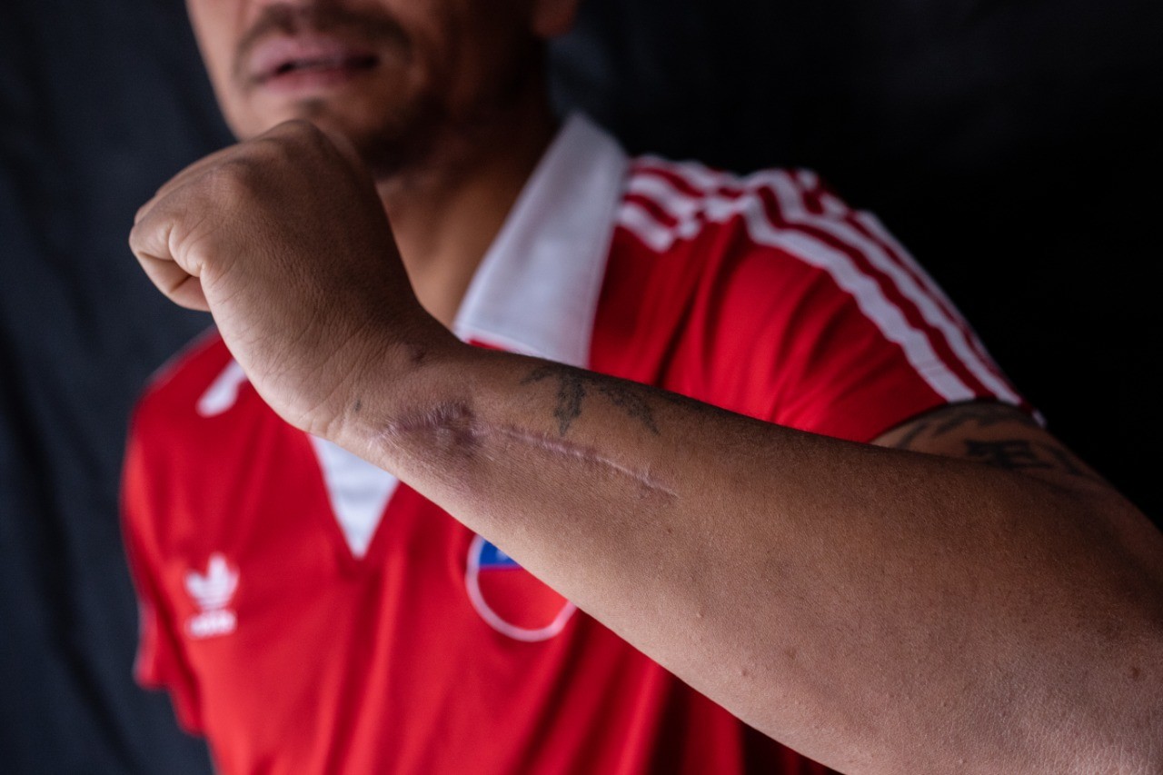 Gracias a ese reflejo dice que el impacto no le alcanzó a llegar a sus ojos. Pero la intención era clara y segura, apuntaron hacia su rostro. Inmediatamente después de la agresión salieron detrás de él, quien en medio de la adrenalina empezó a sentir su brazo débil. “Yo sentí altiro que mi brazo se cayó. Me corría agua de la mano, tenía lleno de sangre”.