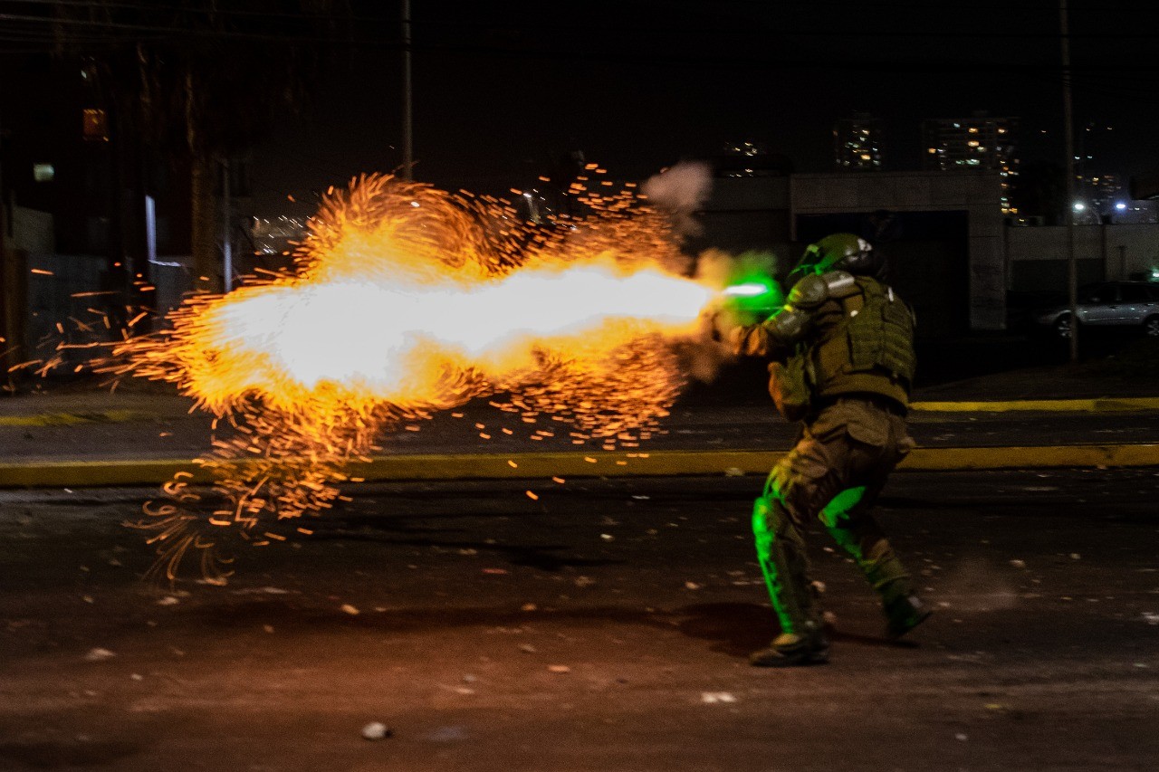 [caption id="attachment_84654" align="alignnone" width="774"] Lacrimógena “Condor” GL-302. Dice que, hasta el día de hoy, la guarda en un rincón de su pieza, la mira de vez en cuando. Esta fue una de las más brutales y más usada en Chile. De octubre a marzo, Carabineros de Chile disparó 193 mil veces sus carabinas lanza lacrimógenas de 37 milímetros y detonó 45 mil granadas lacrimógenas de mano. En total, utilizaron este tipo de disuasivo químico 238 mil veces en el lapso de 183 días, según la información entregada por la institución vía ley de transparencia.[/caption]