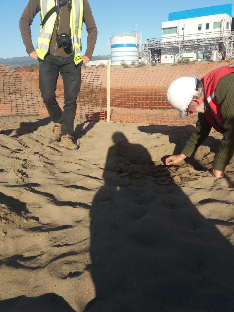 [caption id="attachment_64502" align="alignnone" width="774"] En la foto nuevamente con casco blanco el arqueologo de Forestal Arauco Victor Bustos y dependencias industriales de Celulosa Arauco a un costado del hallazgo[/caption]