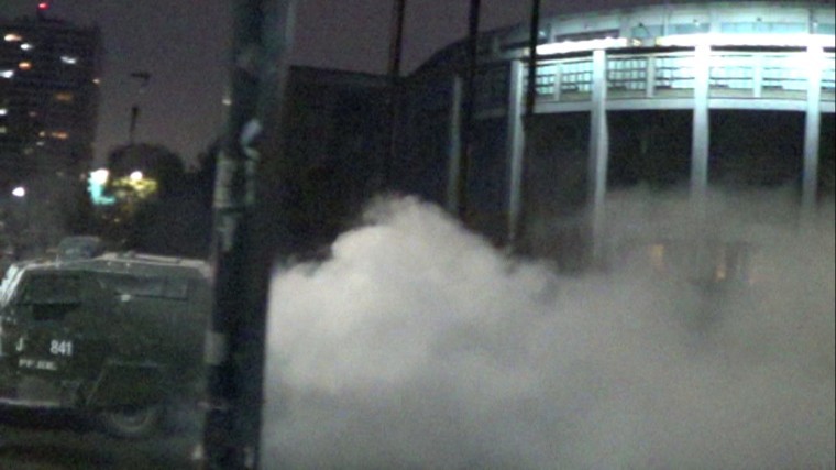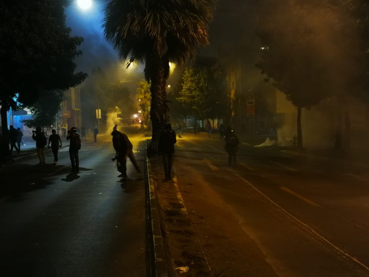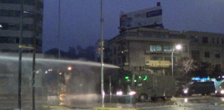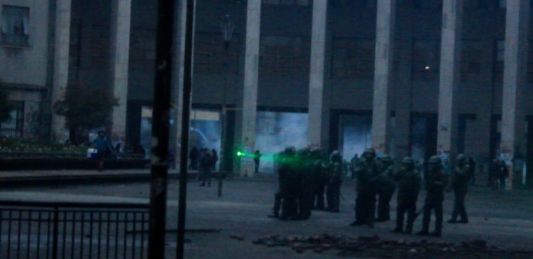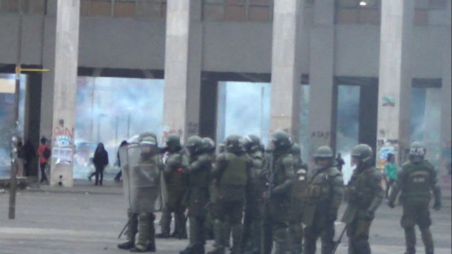 El ambiente en el lugar se tornaba irrespirable por las lácrimógenas lanzadas al aire y al cuerpo de manifestantes. Al anochecer Carabineros comenzó un uso más frecuente de perdigones.