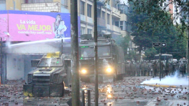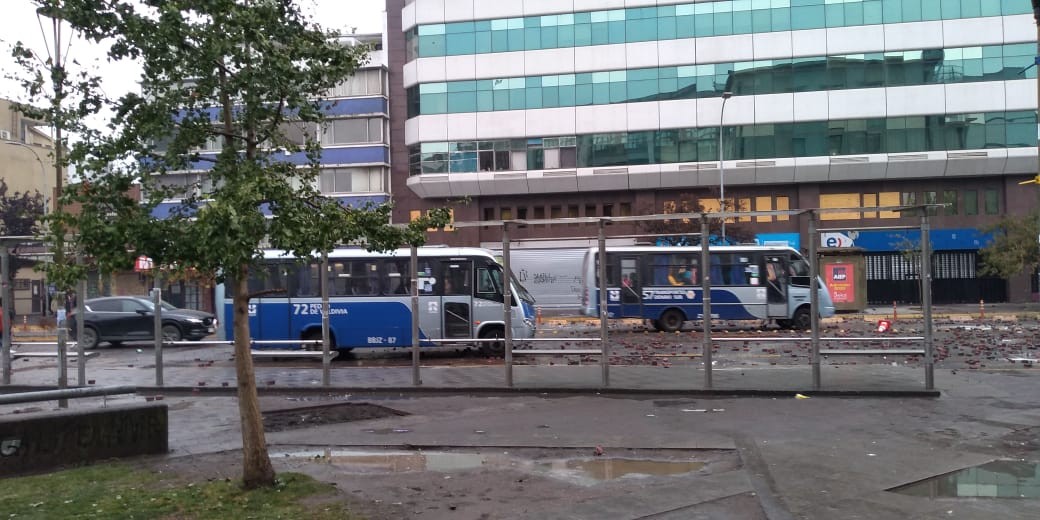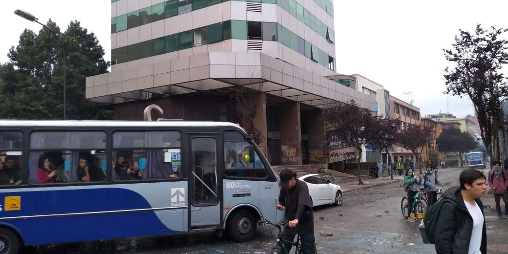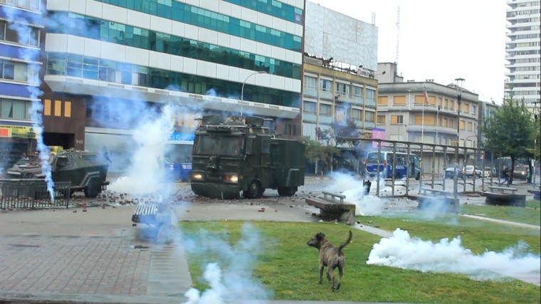 Carabineros aplica gran cantidad de gases lacrimógenos contra manifestantes. Mientras tanto buses de la locomoción pública continuaban pasando por la calle O'Higgins
