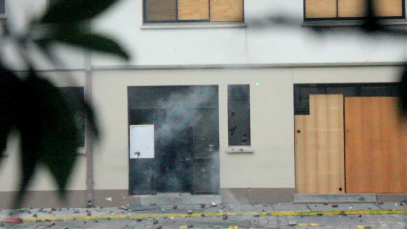 Pese a la fuerte presencia policial, manifestantes apedrearon diversos edificios como la Intendencia, el edificio de Carabineros en Castellón con O'Higgins y el Comando de Operaciones Terrestres (COT) en la misma esquina.