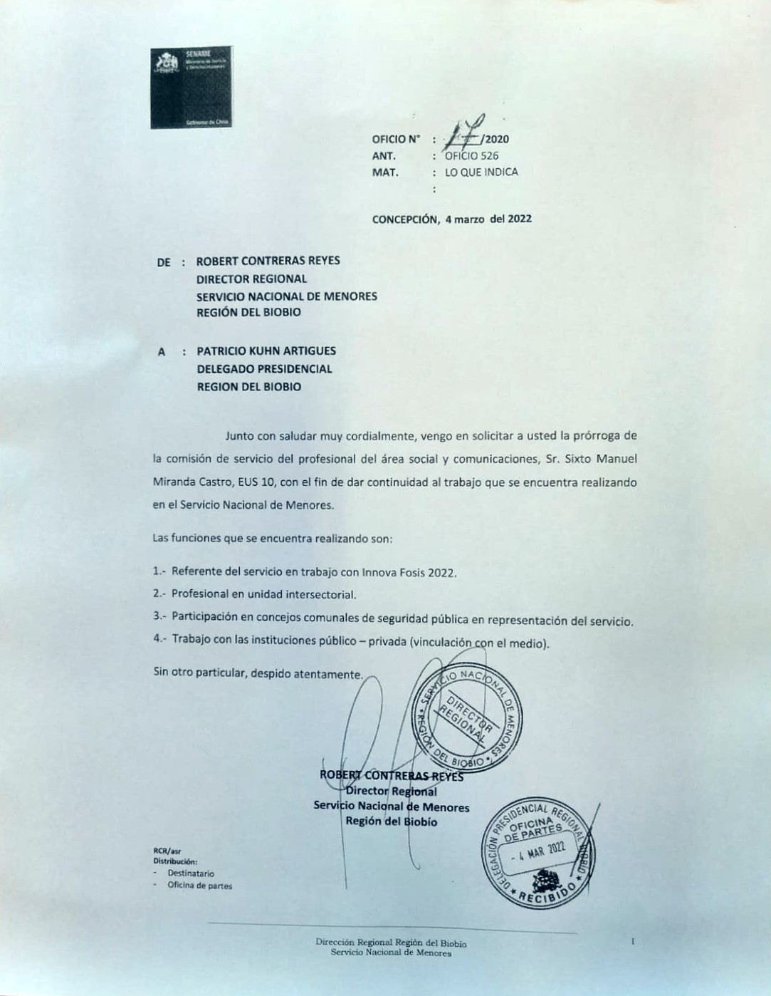Sixto Manuel Miranda Castro es un funcionario público contratado por la Delegación Presidencial Provincial de Concepción, pero que presta servicios bajo la modalidad de "comisión de servicio" en el Servicio Nacional de Menores (Sename) del Biobío, dirigida por el el RN Robert Contreras, ex gobernador provincial, para quien trabajó durante la etapa final del gobierno de Sebastián Piñera.