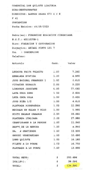 Un pago por $238.590 realizó la Fundación Educación Financiera al restaurante penquista “El Quijote” por un almuerzo que fue rendido por la cuestionada fundación en el mes de mayo. El ágape incluyó bebidas, limonadas y platos de hasta casi 17 mil pesos, todo a cargo del erario público, pues son dineros transferidos directamente por el Gobierno Regional del Biobío.