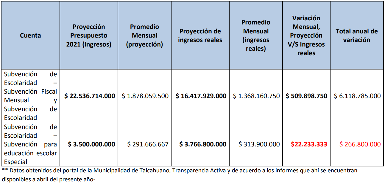 Se trata de una variación que alcanza más de $6.100 millones de pesos por debajo de lo presupuestado para la subvención fiscal mensual y de escolaridad, mientras que para la educación especializada los ingresos percibidos hasta abril de 2021 aumentaron en más de $266 millones.