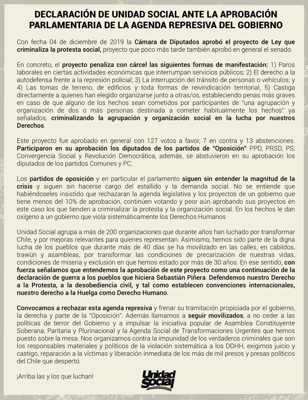 [resumen.cl] Mediante una declaración pública, Unidad Social, la organización que agrupa a sindicatos del mundo privado y gremios del sector público y que ha convocado a las últimas huelgas generales en el país, repudió la decisión de la clase política de aprobar la agenda represiva del gobierno consolidada en la ley “antisaqueos” y “antibarricadas”.