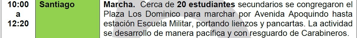 Iniciado el Estallido Social, las y los secundarios pasaron a formar parte constante de los informes del EMCO. Por ejemplo, en este reporte del 30 de octubre de 2019, la inteligencia de las FFAA fijó su mirada en un grupo de 20 estudiantes que protagonizaban manifestaciones en Santiago, el 31 de octubre.