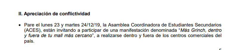 Otro reporte destaca convocatorias a manifestación durante la navidad de 2019, la que se desarrolló en medio del Estallido Social