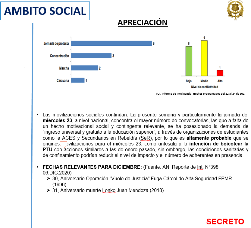 Información sobre el tipo de organización, motivos y ubicación de sus manifestaciones, entre otros, contienen una serie de reportes, que demuestran el seguimiento hacia organizaciones secundarias como la Asamblea Coordinadora de Estudiantes Secundarios (ACES), Secundarios en Rebeldía (SeR) y grupos de autoconvocados en diversas protestas.