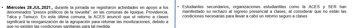 Un año más tarde, en 2021, en un informe de julio y agosto, el EMCO informaba de una serie de reactivaciones en cuanto a la protesta social, destacando que, "es probable que durante el mes de agosto se active la conflictividad en el espacio público, especialmente en la RM, regiones de Valparaíso y Biobío", agregando que, "estudiantes secundarios, organizaciones estudiantiles como la ACES y SER han manifestado su rechazo al regreso presencial a clase".
