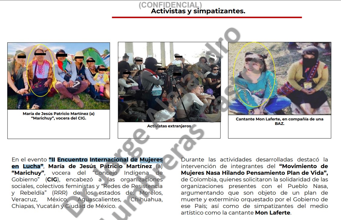 En una investigación a actividades conmemorativas del 26 aniversario del alzamiento zapatista del EZLN en Chiapas. En este reporte, hay una lámina titulada “activistas y simpatizantes”, donde el Sedena ficha a la cantante chilena Mon Laferte.