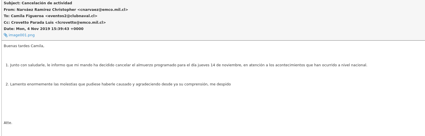 No obstante, otros correos revelados por el hackeo enviados a la funcionaria del Club Naval indican que finalmente la reunión bilateral no se realizó, pues fue suspendida a petición del mismo funcionario, aludiendo a la situación en la que se encontraba el país. Presuntamente podría tratarse del Estallido Social. Pero la situación relatada, con tanta naturalidad, hace pensar que este tipo de acciones puedan ser parte de la cotidianidad en la rama castrense.