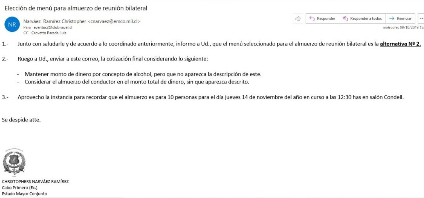Bajo el titulo de "Elección de almuerzo para reunión bilateral" fue enviado un correo por parte de un funcionario del Estado Mayor Conjunto el 9 de octubre del año 2019 a una funcionaria del Club Naval de Valparaíso, con copias a otros funcionarios de la Armada, en donde se detalla la elección del tipo de almuerzo para los comensales y se expresa considerar en la cotización final "mantener monto de dinero por concepto de alcohol, pero que no aparezca la descripción de este".