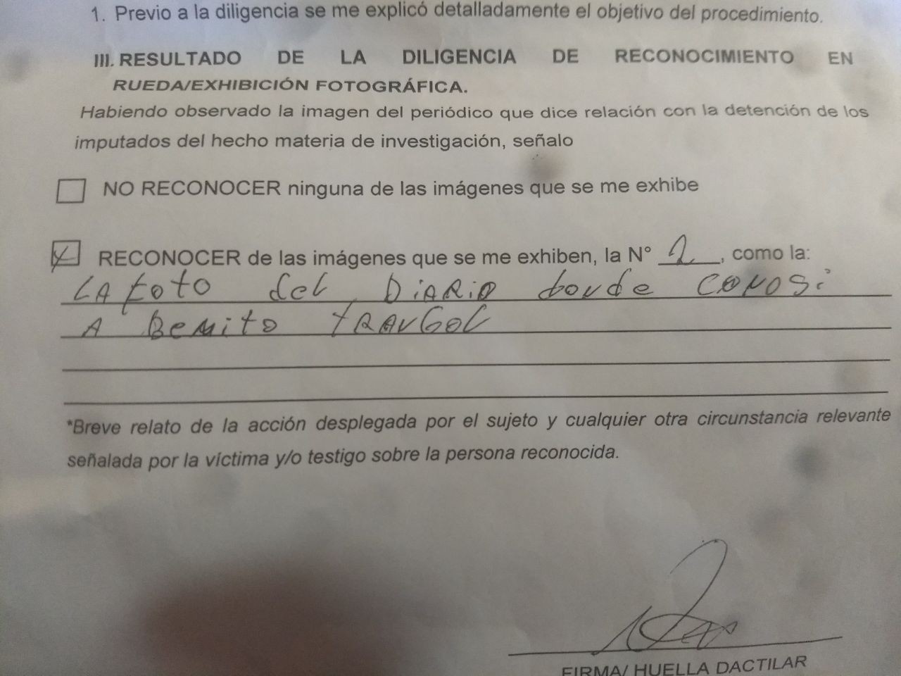 Otra gran irregularidad en el reconocimiento que hicieron los testigos protegidos en contra de los mapuche -afirma la comunera- fue que al señalar a uno de los implicados, específicamente a Benito Trangol, lo hicieron otorgándole el número tres, pero su foto correspondía a la número dos. Es decir, el testigo estaba en un evidente error. A pesar de esta gran equivocación, los jueces del tribunal de igual forma consideraron las declaraciones acusatorias, recabadas por los querellantes.