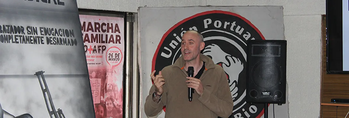 La exposición estuvo a cargo de Franck Gaudichaud, investigador francés de la Universidad de Grenoble, militante y miembro del colectivo rebelion.org, quien reunió testimonios de asesores y dirigentes de la Unión Portuaria del Biobío durante los años 2014 y 2015.