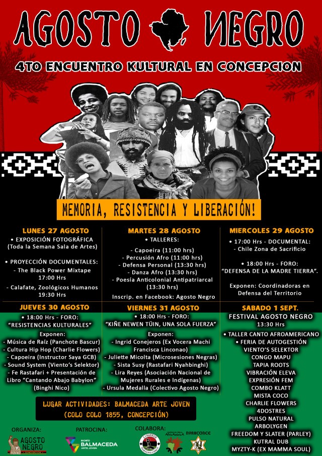 Por Juan Contreras Jara / resumen.clMemoria, resistencia y liberación son las propuestas que despliega por cuarto año consecutivo el festival Agosto Negro en Concepción, semana llena talleres, ponencias, documentales, entre otras actividades, dirigidas a generar instancias de autoeducación y de valoración por la lucha, resistencia y autonomía de los pueblos. Las jornadas comienzan hoy a las 17:00 horas en dependencias del centro cultural BioBío Balmaceda Arte Joven y culminan en el mismo espacio, el próximo 1 de septiembre, con los últimos talleres y una jornada musical como cierre.