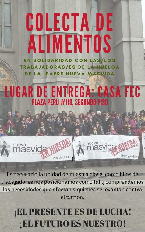 El no pago de salarios, en todos estos días de huelga, ha sido el contexto del surgimiento de la campaña de recolección de alimentos, organizada por la Coordinadora Obrero-Estudiantil. De hecho, este es otro punto de disputa en la negociación, pues la empresa no está dispuesta a cancelarlos. La acción de solidaridad para con los y las huelguistas busca atenuar los efectos del cese de ingresos, herramienta usada por el empresariado para presionar a quienes han impulsado un proceso de lucha para hacerles desistir de ello. El lugar de recepción será en la oficina de la FEC [Federación de Estudiantes de la Universidad de Concepción], ubicada en Plaza Perú 119, segundo piso.