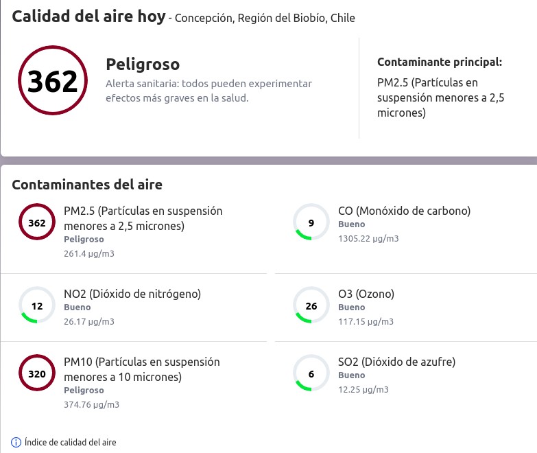 Revise a continuación la peligrosa situación del material particulado (en µg/m3) en las zonas afectadas directamente por los megaincendios, tales como Santa Juana, Arauco, Nacimiento, Coronel, Lebu, Purén, Renaico, Mulchén, Los Ángeles, Yumbel, Cabrero, Hualqui, Penco, Tomé, Dichato, Coelemu, Quirihue, Cauquenes, Cobquecura, Chillán.
