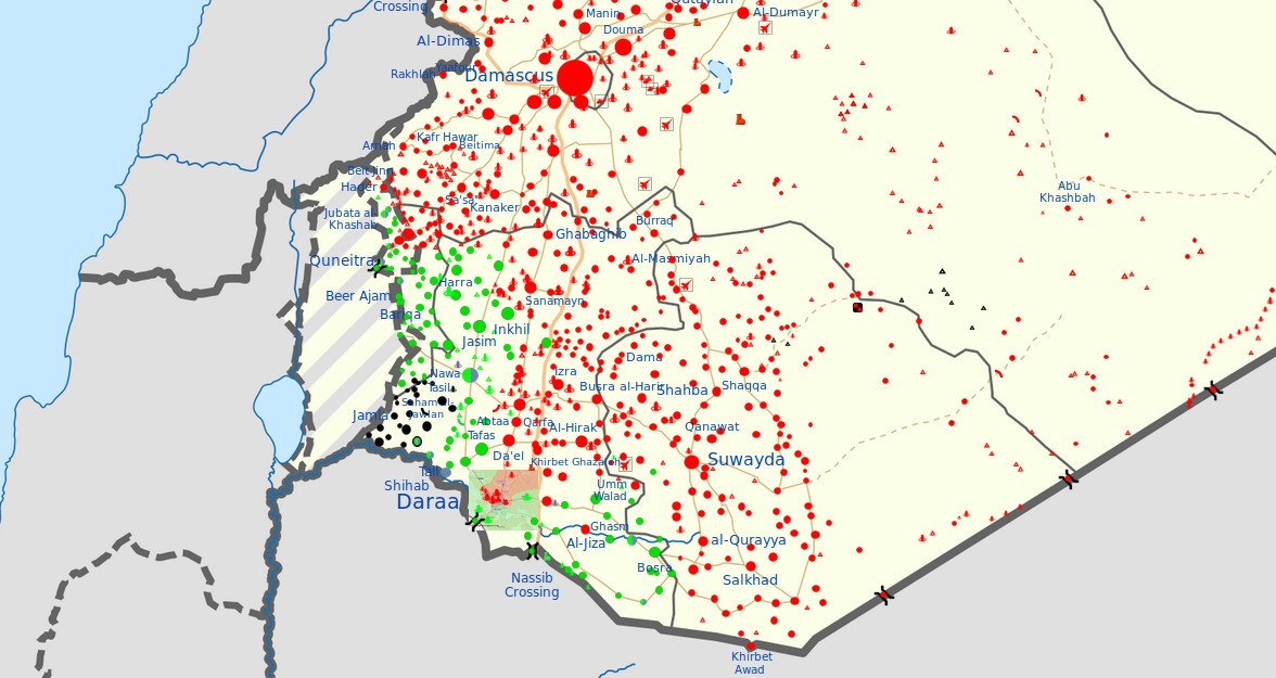 El avance en el desierto y el control total logrado en torno a los últimos bolsones al norte de Homs y los que rodeaban la capital Damasco, llevó al ejército sirio a desplegar un contingente al sur del territorio en la provincia de Daraa, fronteriza con Jordania. Allí se ha desarrollado en las dos últimas semanas un arrollador avance de las fuerzas gubernamentales contra las fuerzas yihadistas, las cuales han perdido numerosas ciudades en el oriente de la provincia.