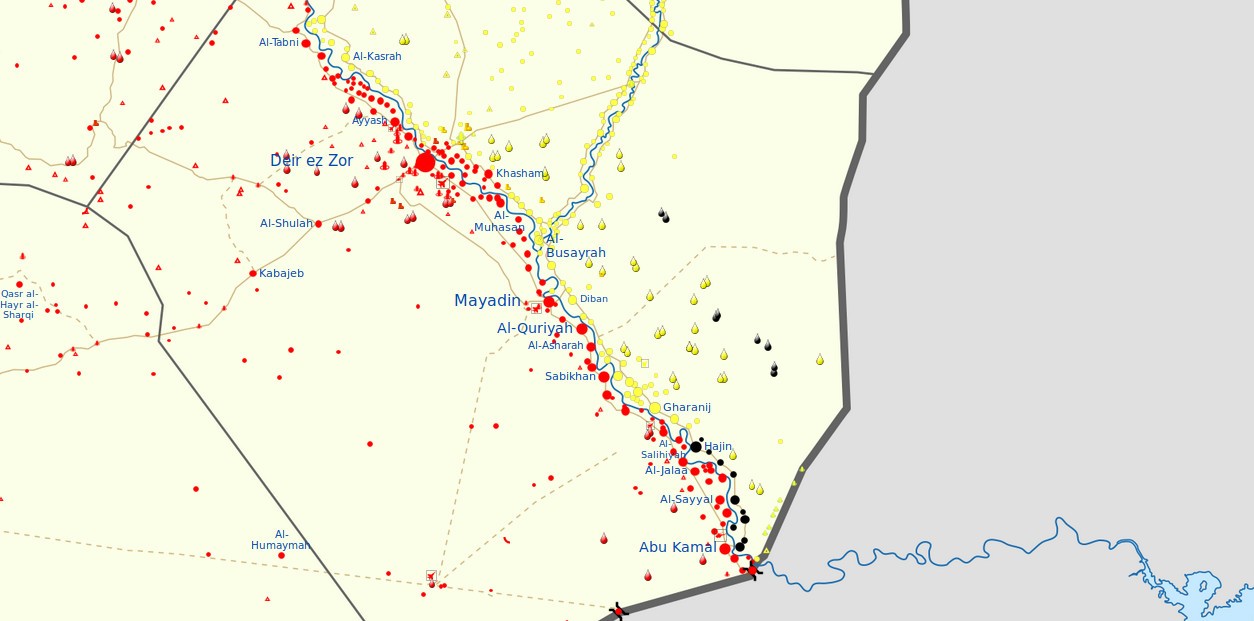 Otra zona controlada por el DAESH está en el extremo oriente de Siria, en una zona fronteriza con Iraq, donde las fuerzas gubernamentales no pueden acceder por tierra ya que se encuentra rodeada por fuerzas kurdas y que significaría abrir un conflicto entre el gobierno de Damasco y las fuerzas kurdas del YPG que lideran las denominadas Fuerzas Democráticas Sirias (SDF) con las cuales el gobierno sirio mantiene un dialogo en estos momentos.