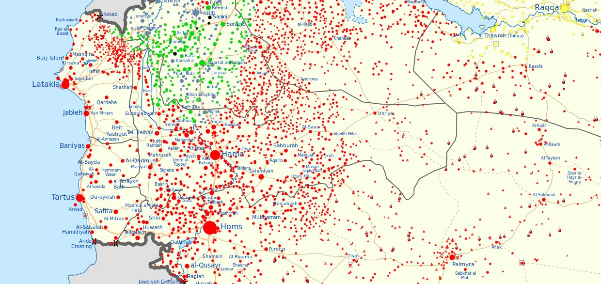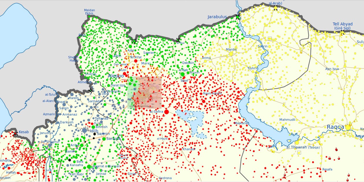 En rojo: Gobierno sirio. En verde: Oposición siria. En amarillo: Fuerzas Democráticas Sirias (incluyen a las YPG-YPJ kurdas). En gris: grupo Tahrir al-Sham. En negro: Estado Islámico (Daesh). Fuente: https://en.wikipedia.org/wiki/Template:Syrian_Civil_War_detailed_map
