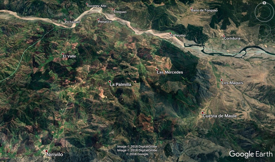 Zona de influencia de un eventual proyecto minero entre Nirivilo, La Palmilla y la ribera sur del río Maule. Foto: Google Earth