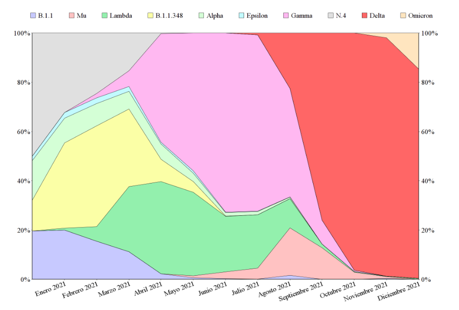 El informe indica que en la semana del 5 al 11 de diciembre "la variante Delta continuó siendo la más frecuente por decimocuarta semana consecutiva con un 91,8% (n=1.202), Omicron constituyó el 2,5% (n=33) y Mu se identificó en una muestra del total analizado (n=1.310). Las variantes Alfa, Gamma y Lambda no fueron identificadas preliminarmente en este periodo"