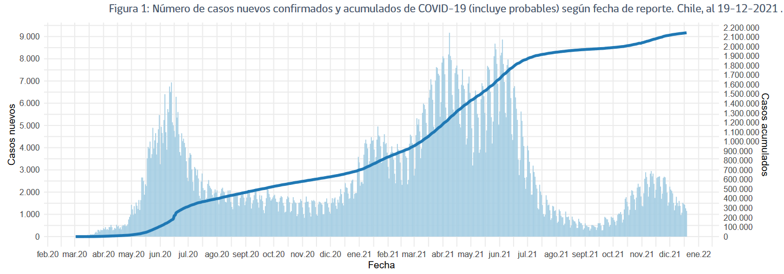 Evolución de los linajes predominantes de SARS-CoV-2 en Chile entre diciembre de 2020 y diciembre 2021. Fuente: INE
