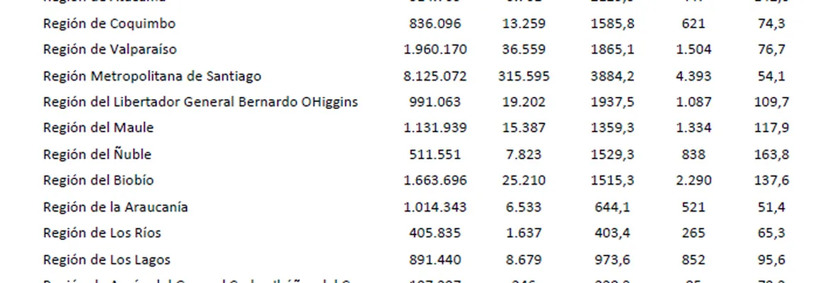 La siguiente tabla muestra el número de casos y tasa de incidencia de casos Covid-19 según región de residencia en Chile, con fecha al 20 de septiembre de 2020.