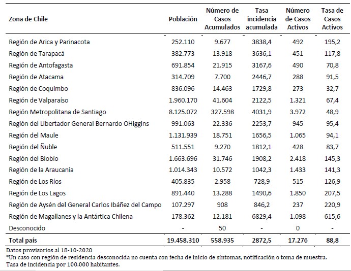 La siguiente tabla muestra el número de casos y tasa de incidencia de casos COVID-19 según región de residencia en Chile, con fecha al 18 de octubre de 2020.