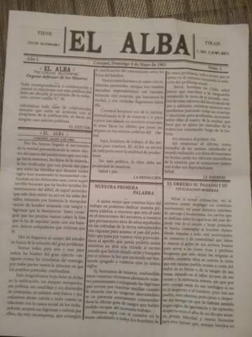 El Alba se nutrió de su contexto, pues el “receptor ideal”, siguiendo a Marianna Di Stefano, fueron los mineros, a quiénes se apelaba directamente y de quienes se sentían representantes. “El Alba os servirá de intérprete entre la multitud de productores”, declaraban en su primer número. De igual forma, en otro apartado, un anónimo colaborador se identificaba como “un minero” que “ha trabajado tanto por arrancar el carbón de las minas”, y que, como tantos otros, se le “ha pagado mal”. Más allá de esta identificación, se colaban también por sus palabras una reivindicación específica a la condición indígena y mestiza de las tierras del sur, al señalar que por sus “venas corre sangre de Lautaro y Caupolicán”.