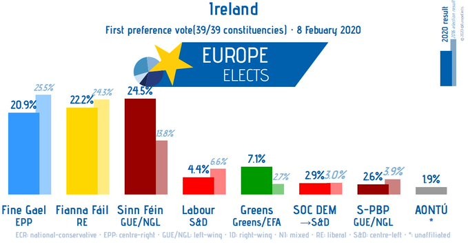 En las elecciones celebradas el pasado 8 febrero, el partido más votado en la inmensa mayoría de los distritos electorales en Irlanda, Sinn Féin (SF), se quedó con cerca del 25% de los sufragios, en un sistema parlamentario donde el partido con más escaños es el llamado a formar gobierno al designar un Primer Ministro, mientras el Presidente sólo cumple funciones protocolares.
