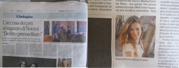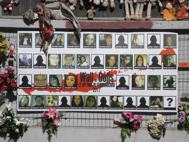 Otros dos afiches instalados sobre el muro muestran el rostro de 104 mujeres víctimas de femicidio durante el año 2016 en Italia y el rostro de otras 40 mujeres que han sido víctimas de femicidio entre los meses de enero y junio del 2017 en Italia, pero indudablemente que ese número al día de hoy es mucho mayor, porque precisamente los diarios del 17 de septiembre pasado daban cuenta del asesinato de Noemi Durini, una muchacha de 16 años, a manos de su pololo.