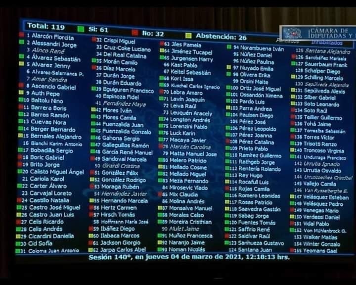 La medida contó con el respaldo de 61 diputadas/os, mientras que otros 32 votaron en contra y 26 se abstuvieron. Respecto a la cifra de aprobación, además de militantes del oficialismo, cuatro votos fueron claves: todos de militantes de la Democracia Cristiana (DC).